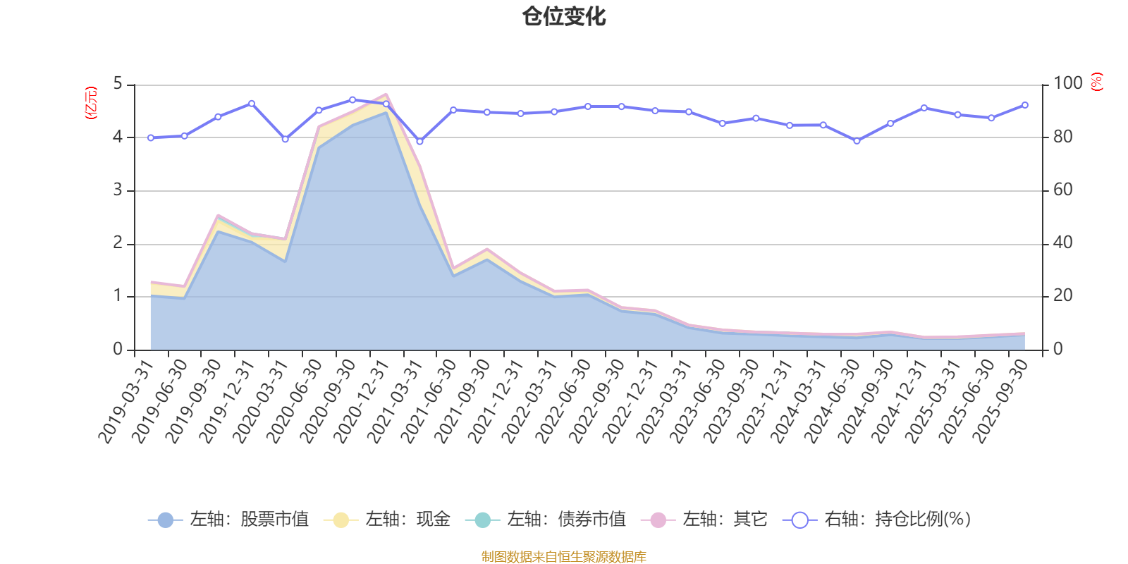 据定期报告数据统计,近三年平均股票仓位为87.16%,同类平均为72.14%。2020年三季度末基金达到94.27%的最高仓位,2021年一季度末最低,为78.57%。