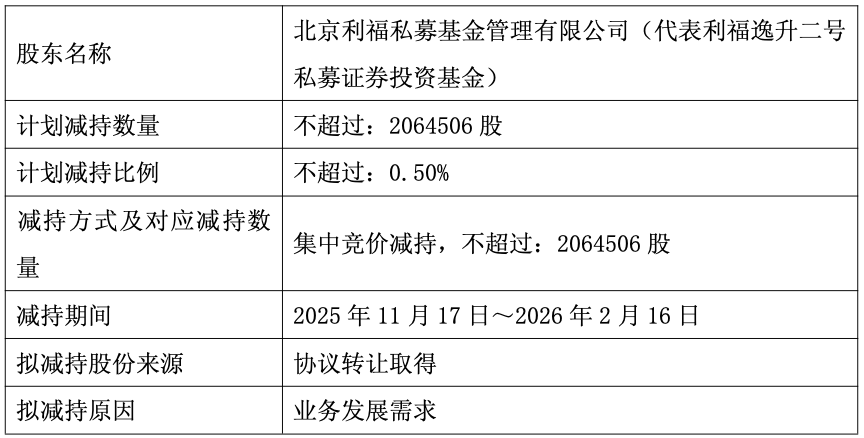 利福逸升二号私募证券投资基金因自身业务发展需求,拟通过集中竞价方式减持不超过2,064,506股公司股份,占公司股份总数比例不超过0.50%。