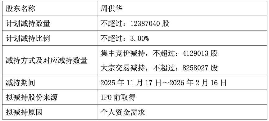 周供华因个人资金需求,拟通过集中竞价和大宗交易相结合的方式减持不超过12,387,040股公司股份,占公司股份总数比例不超过3.00%。其中,拟通过集中竞价方式减持的,任意连续90日内减持总数不超过公司股份总数的1%;拟通过大宗交易方式减持的,任意连续90日内减持总数不超过公司股份总数的2%。