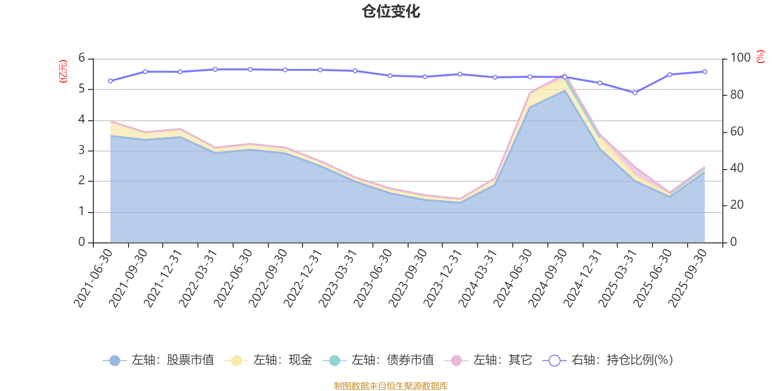 据定期报告数据统计,近三年平均股票仓位为90.2%,同类平均为86.36%。2022年一季度末基金达到94.15%的最高仓位,2025年一季度末最低,为81.5%。