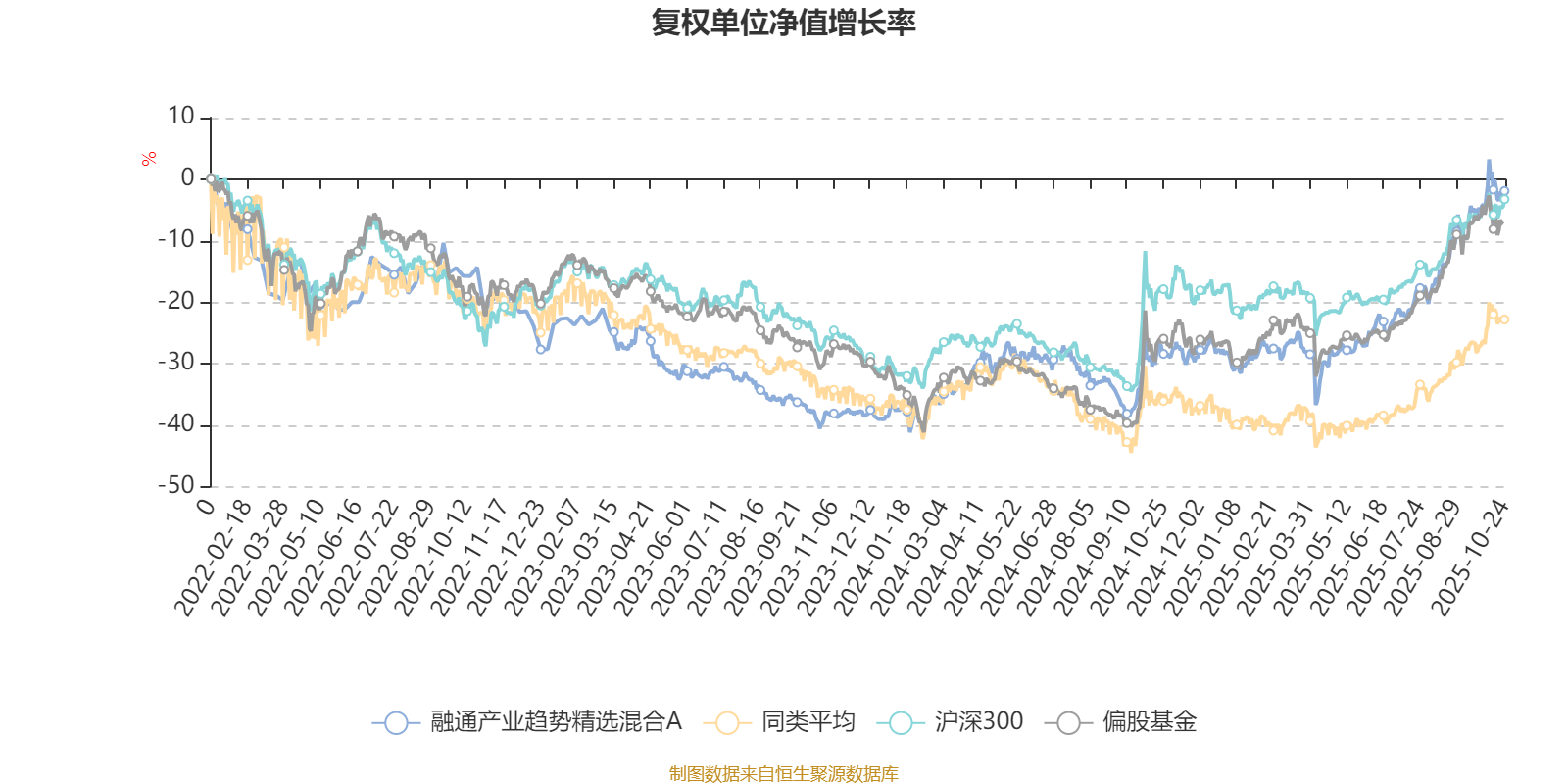 截至10月24日,融通产业趋势精选混合A近三个月复权单位净值增长率为19.20%,位于同类可比基金22/49;近半年复权单位净值增长率为37.38%,位于同类可比基金21/49;近一年复权单位净值增长率为36.01%,位于同类可比基金19/42;近三年复权单位净值增长率为14.52%,位于同类可比基金20/29。