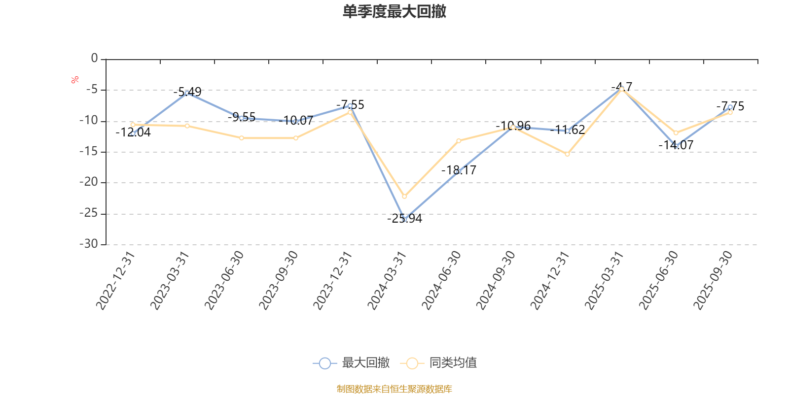 截至10月24日,基金近三年最大回撤为34.25%,同类可比基金排名13/75。单季度最大回撤出现在2024年一季度,为25.94%。