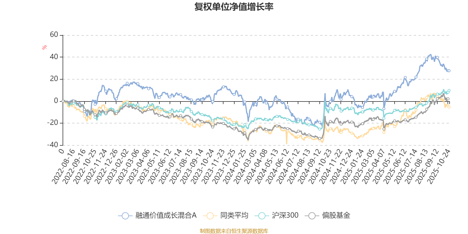 截至10月24日,融通价值成长混合A近三个月复权单位净值增长率为-2.94%,位于同类可比基金46/106;近半年复权单位净值增长率为19.30%,位于同类可比基金47/104;近一年复权单位净值增长率为28.71%,位于同类可比基金49/101;近三年复权单位净值增长率为29.49%,位于同类可比基金13/75。
