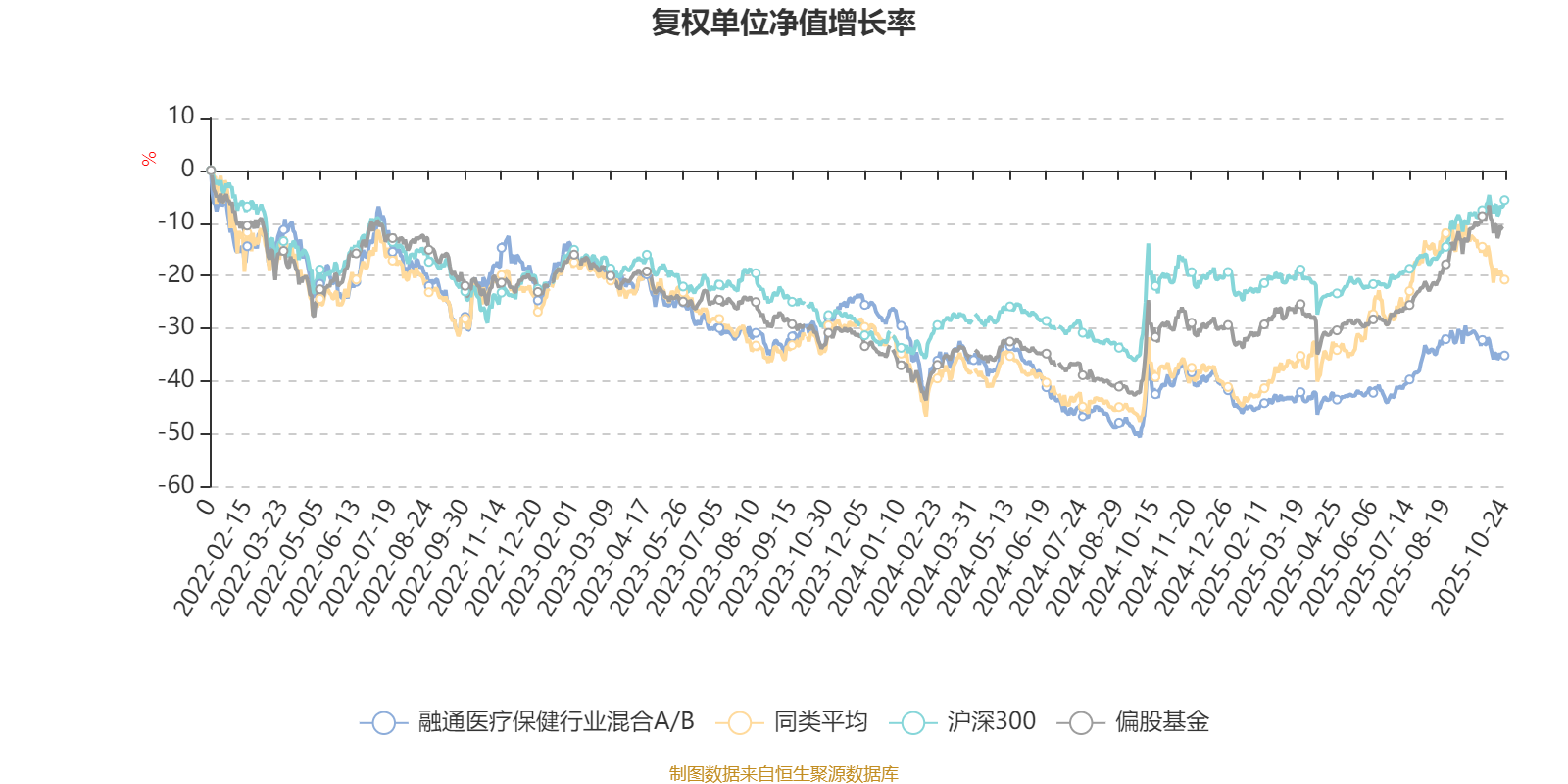 截至10月24日,融通医疗保健行业混合A/B近三个月复权单位净值增长率为2.44%,位于同类可比基金16/106;近半年复权单位净值增长率为13.41%,位于同类可比基金77/104;近一年复权单位净值增长率为9.87%,位于同类可比基金88/101;近三年复权单位净值增长率为-16.10%,位于同类可比基金66/75。