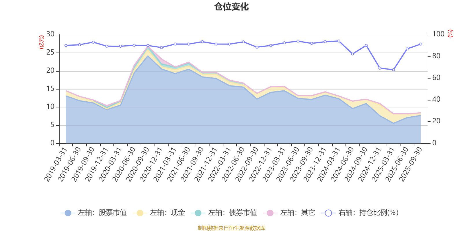 据定期报告数据统计,近三年平均股票仓位为86.98%,同类平均为86.73%。2024年一季度末基金达到94.16%的最高仓位,2025年一季度末最低,为67.75%。