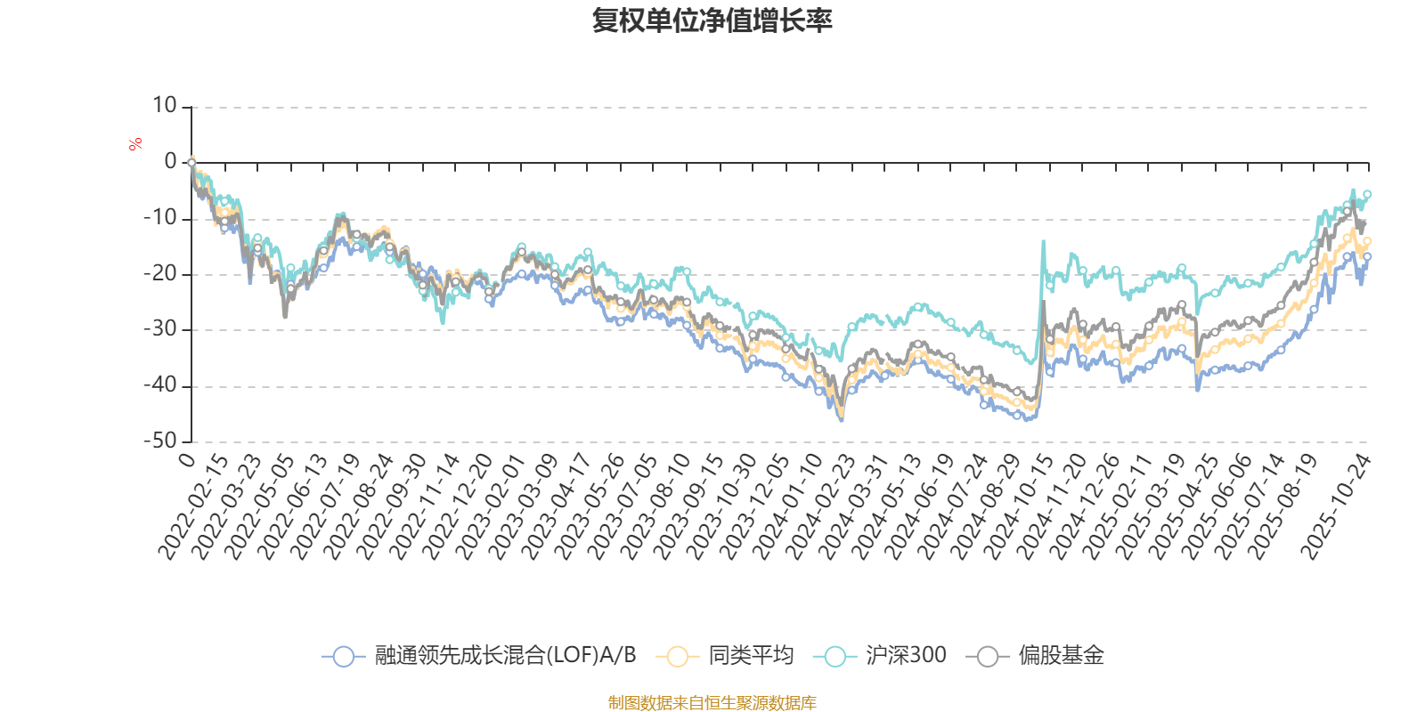 截至10月24日,融通领先成长混合(LOF)A/B近三个月复权单位净值增长率为21.53%,位于同类可比基金49/185;近半年复权单位净值增长率为32.55%,位于同类可比基金69/185;近一年复权单位净值增长率为29.72%,位于同类可比基金77/181;近三年复权单位净值增长率为4.87%,位于同类可比基金133/175。