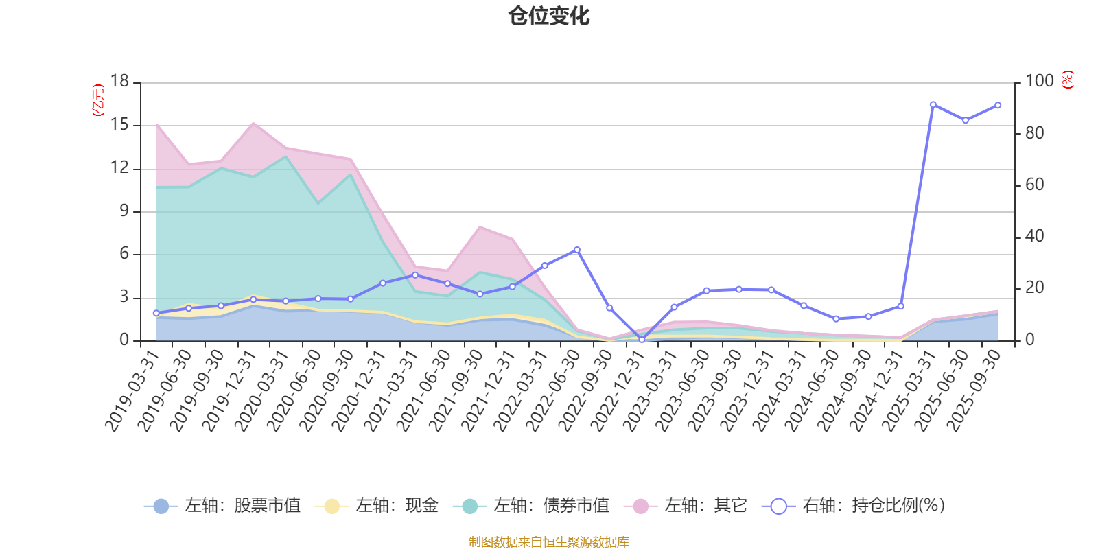 据定期报告数据统计,近三年平均股票仓位为32.09%,同类平均为72.14%。2025年一季度末基金达到91.4%的最高仓位,2022年末最低,为0.42%。