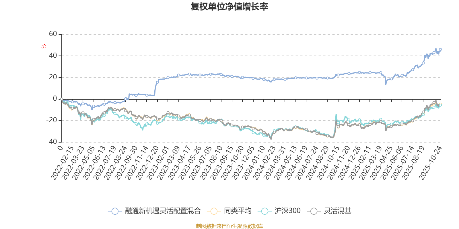 截至10月24日,融通新机遇灵活配置混合近三个月复权单位净值增长率为11.12%,位于同类可比基金647/1287;近半年复权单位净值增长率为23.11%,位于同类可比基金630/1287;近一年复权单位净值增长率为18.86%,位于同类可比基金714/1287;近三年复权单位净值增长率为40.14%,位于同类可比基金189/1286。