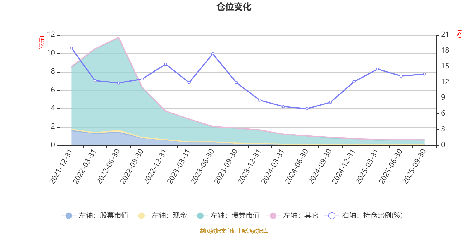 据定期报告数据统计,近三年平均股票仓位为11.77%,同类平均为19.03%。2021年末基金达到18.54%的最高仓位,2024年上半年末最低,为6.96%。