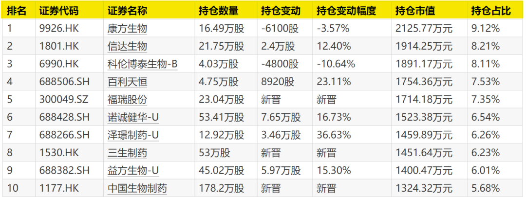 福瑞股份、三生制药、中国生物制药“新晋”十大重仓股。与二季度相比,诺诚健华-U、益方生物-U、泽璟制药-U、信达生物、百利天恒获不同程度加仓,康方生物、科伦博泰生物-B遭减仓。