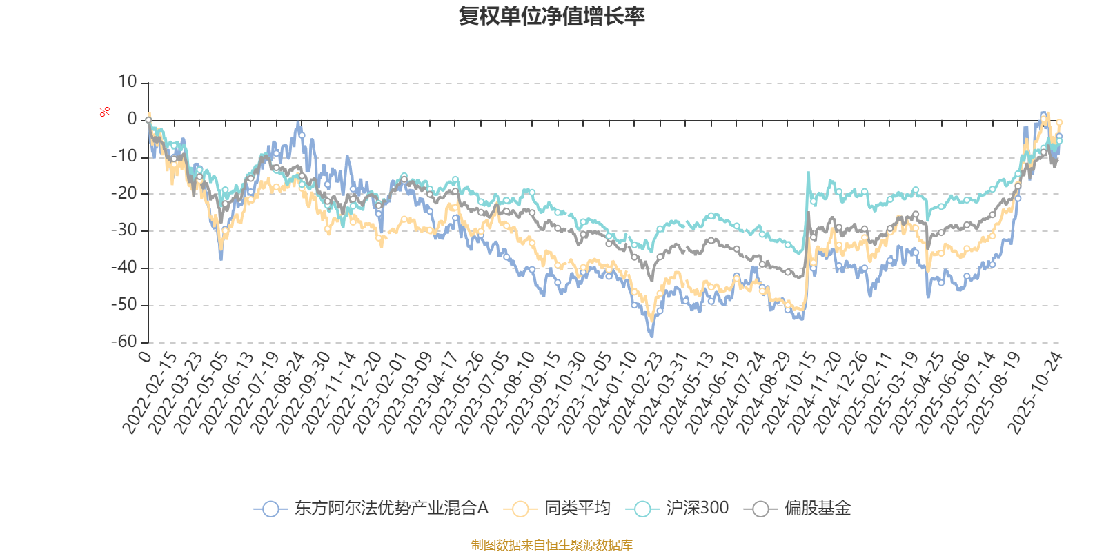 截至10月24日,东方阿尔法优势产业混合A近三个月复权单位净值增长率为50.41%,位于同类可比基金38/229;近半年复权单位净值增长率为70.96%,位于同类可比基金62/229;近一年复权单位净值增长率为48.99%,位于同类可比基金122/213;近三年复权单位净值增长率为14.92%,位于同类可比基金134/158。