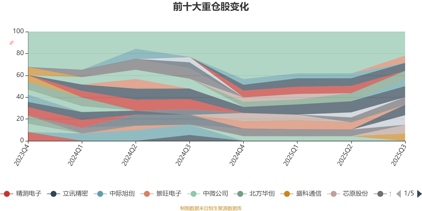 该基金持股集中度较高。截至2025年三季度末,基金十大重仓股分别是胜宏科技、寒武纪、兆易创新、芯原股份、锐捷网络、瑞芯微、英维克、华丰科技、盛科通信、中科曙光。