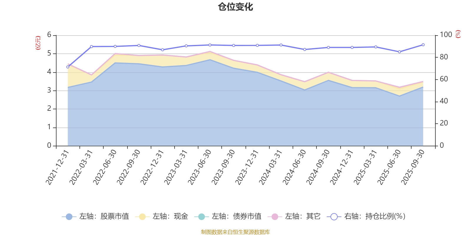 据定期报告数据统计,近三年平均股票仓位为89.35%,同类平均为87.57%。2025年三季度末基金达到91.42%的最高仓位,2021年末最低,为71.32%。