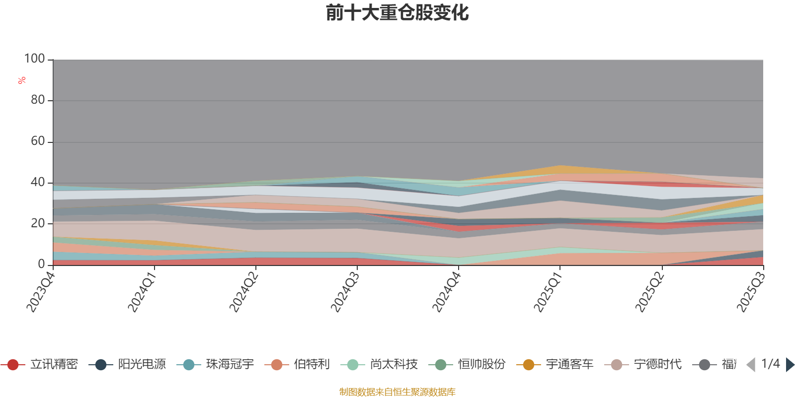 截至2025年三季度末,基金十大重仓股分别是宁德时代、松原安全、中国汽研、立讯精密、福耀玻璃、新泉股份、阳光电源、湖南裕能、福田汽车、长城汽车。