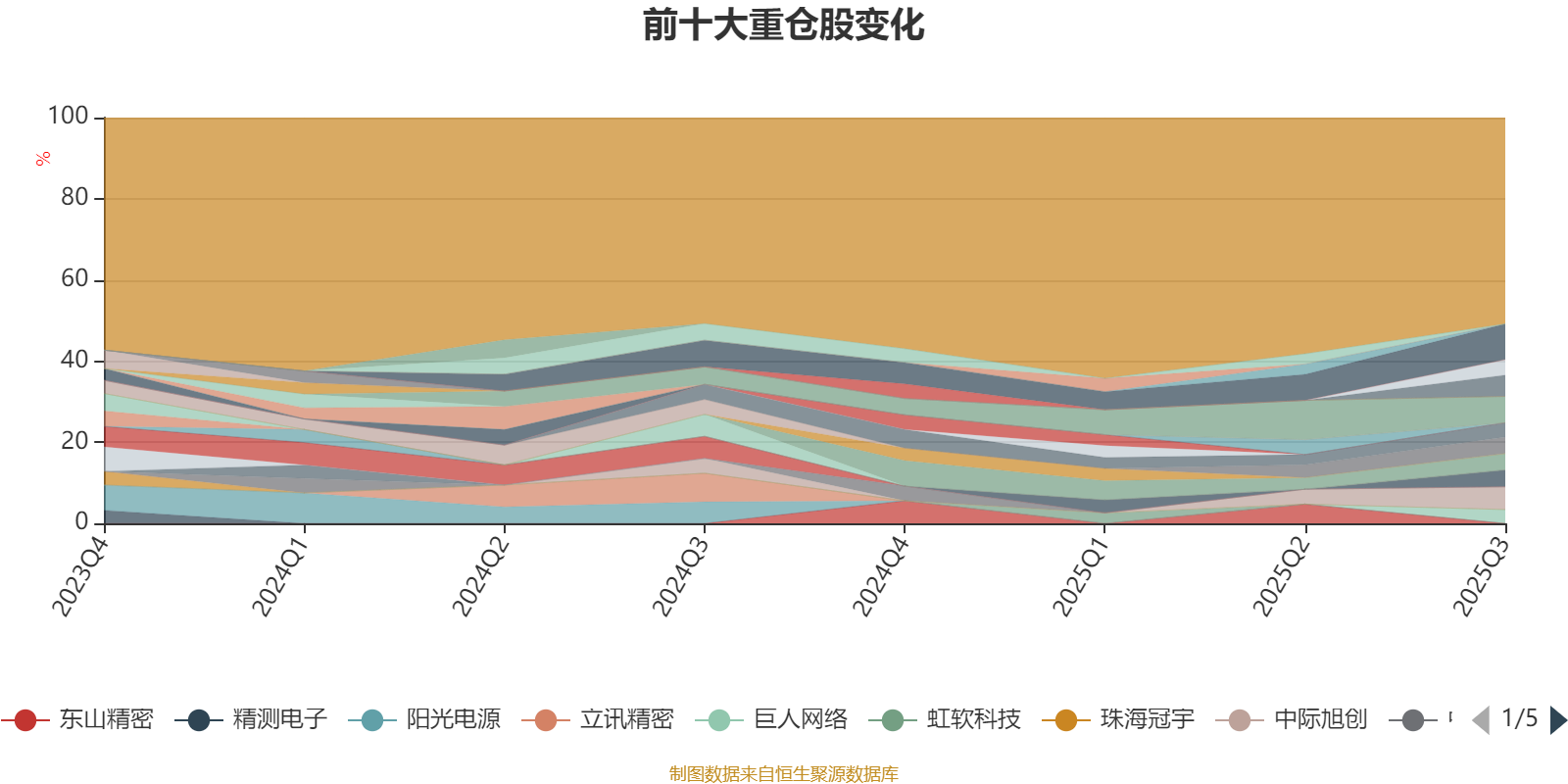 截至2025年三季度末,基金十大重仓股分别是新易盛、胜宏科技、中际旭创、工业富联、芯原股份、迈威生物、寒武纪、天孚通信、海光信息、巨人网络。