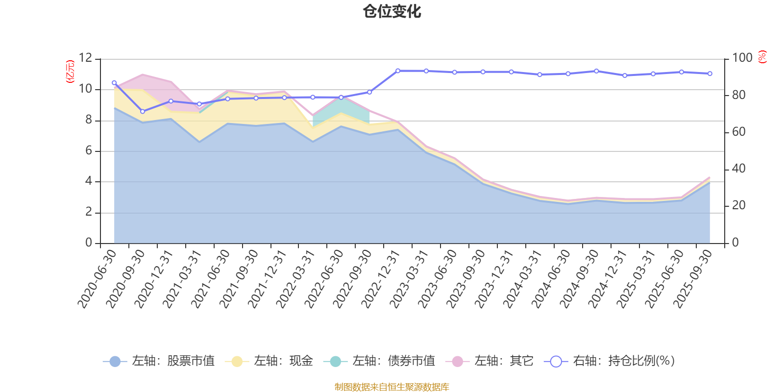 据定期报告数据统计,近三年平均股票仓位为92.49%,同类平均为85.47%。2022年末基金达到93.5%的最高仓位,2020年三季度末最低,为71.46%。