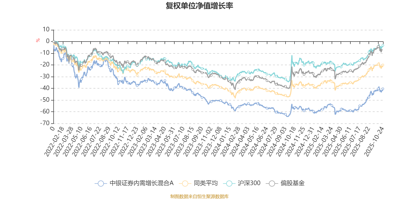 截至10月24日,中银证券内需增长混合A近三个月复权单位净值增长率为33.46%,位于同类可比基金55/689;近半年复权单位净值增长率为45.87%,位于同类可比基金89/688;近一年复权单位净值增长率为36.37%,位于同类可比基金192/653;近三年复权单位净值增长率为-8.37%,位于同类可比基金289/363。