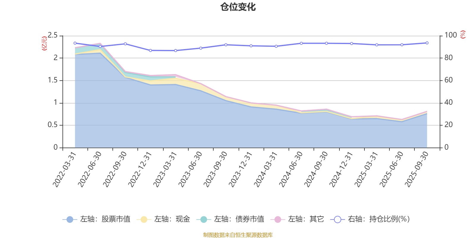 据定期报告数据统计,近三年平均股票仓位为91.06%,同类平均为83.41%。2025年三季度末基金达到93.58%的最高仓位,2023年一季度末最低,为86.74%。