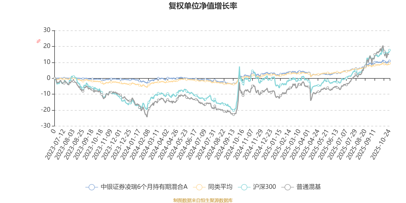 截至10月24日,中银证券凌瑞6个月持有期混合A近三个月复权单位净值增长率为5.00%,位于同类可比基金94/629;近半年复权单位净值增长率为8.32%,位于同类可比基金134/629;近一年复权单位净值增长率为9.11%,位于同类可比基金180/623。