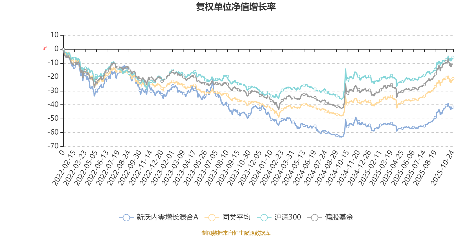 截至10月24日,新沃内需增长混合A近三个月复权单位净值增长率为26.33%,位于同类可比基金108/689;近半年复权单位净值增长率为36.21%,位于同类可比基金190/688;近一年复权单位净值增长率为26.55%,位于同类可比基金330/653;近三年复权单位净值增长率为-15.22%,位于同类可比基金318/363。