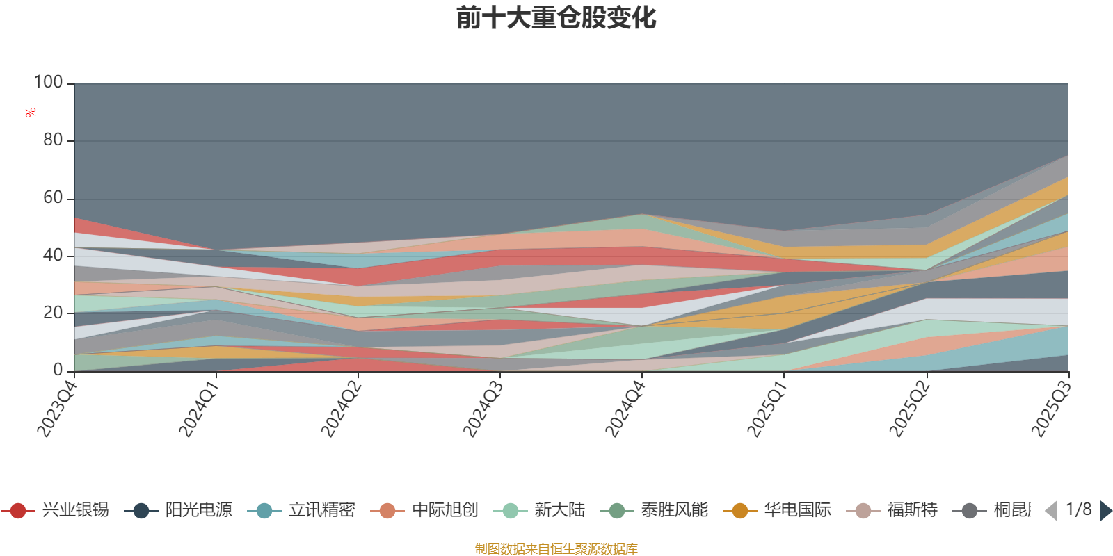 截至2025年三季度末,基金十大重仓股分别是立讯精密、富临精工、协创数据、宁德时代、乐鑫科技、蓝思科技、恺英网络、欣旺达、阳光电源、豪能股份。