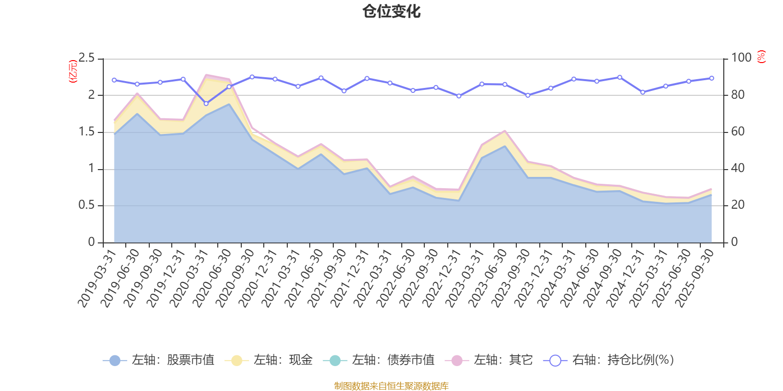 据定期报告数据统计,近三年平均股票仓位为85.53%,同类平均为72.18%。2020年三季度末基金达到90.06%的最高仓位,2020年一季度末最低,为75.58%。