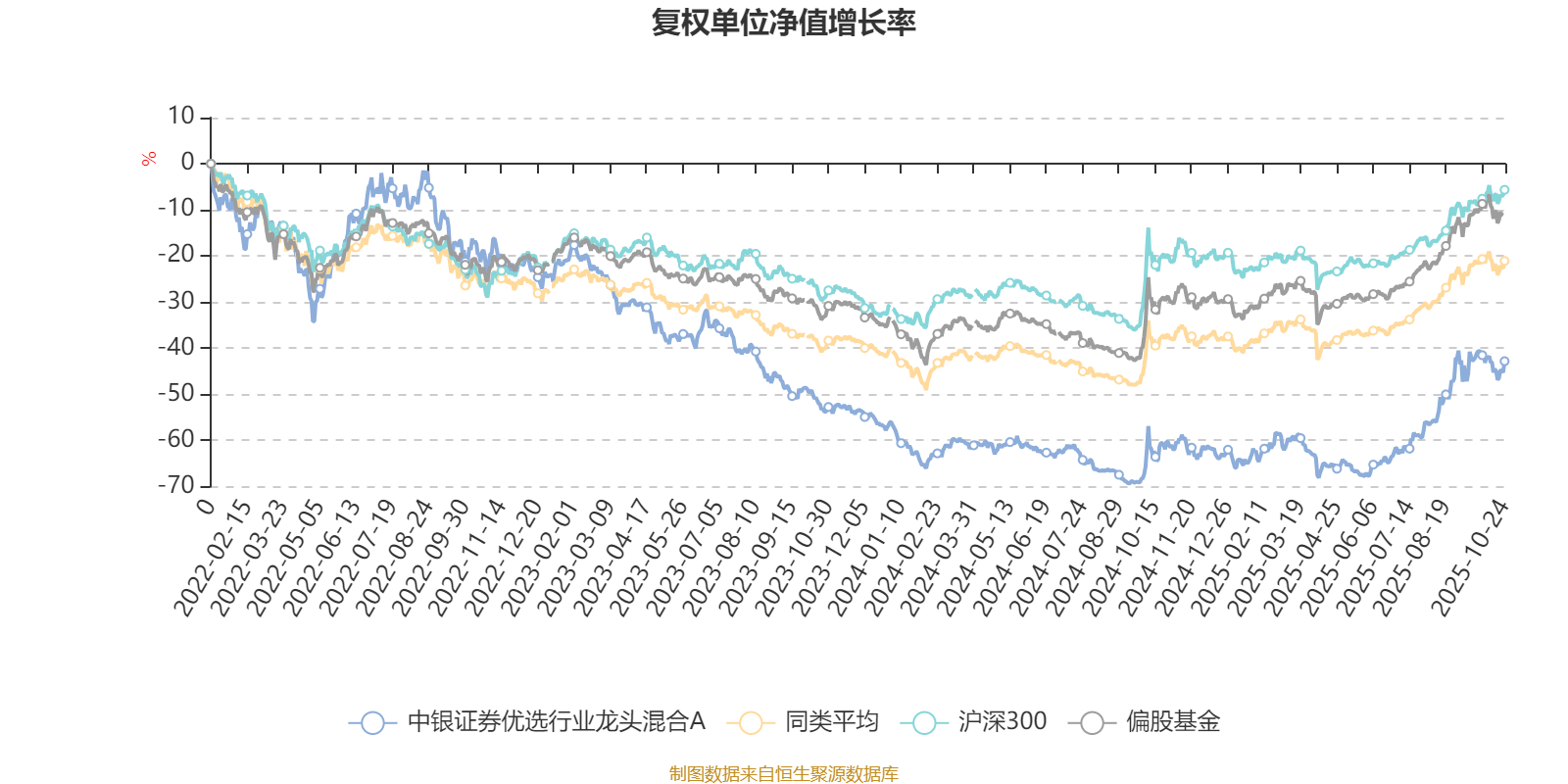 截至10月24日,中银证券优选行业龙头混合A近三个月复权单位净值增长率为40.54%,位于同类可比基金28/689;近半年复权单位净值增长率为68.08%,位于同类可比基金25/688;近一年复权单位净值增长率为50.12%,位于同类可比基金79/653;近三年复权单位净值增长率为-27.30%,位于同类可比基金349/363。