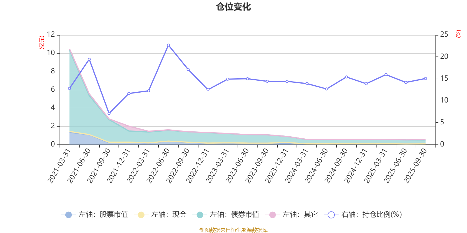 据定期报告数据统计,近三年平均股票仓位为14.37%,同类平均为19.03%。2022年上半年末基金达到22.69%的最高仓位,2021年三季度末最低,为7.12%。