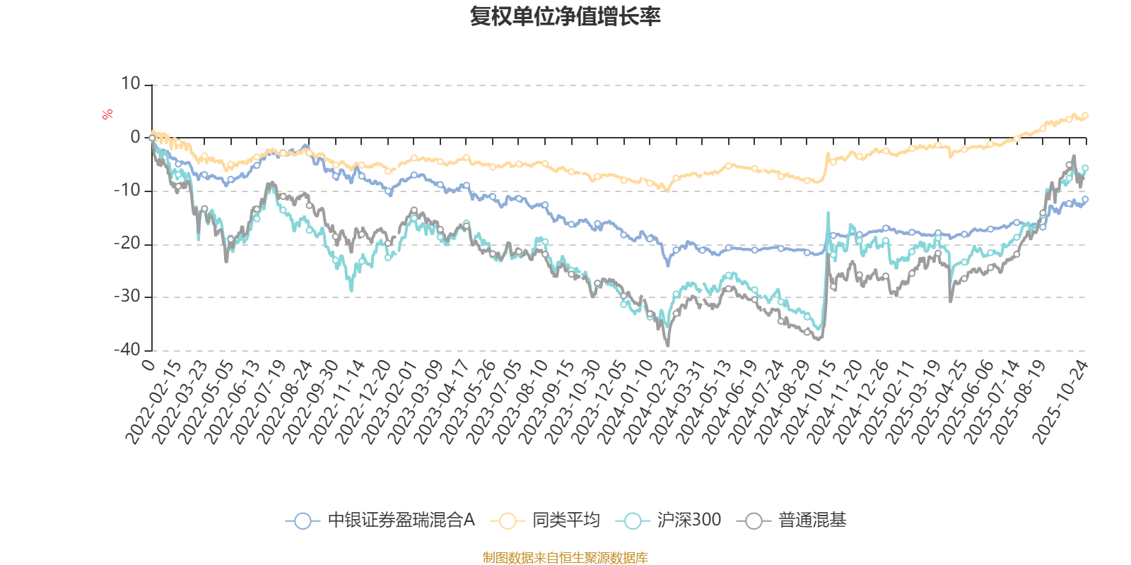 截至10月24日,中银证券盈瑞混合A近三个月复权单位净值增长率为5.74%,位于同类可比基金73/629;近半年复权单位净值增长率为7.91%,位于同类可比基金146/629;近一年复权单位净值增长率为8.46%,位于同类可比基金215/623;近三年复权单位净值增长率为-4.14%,位于同类可比基金543/556。