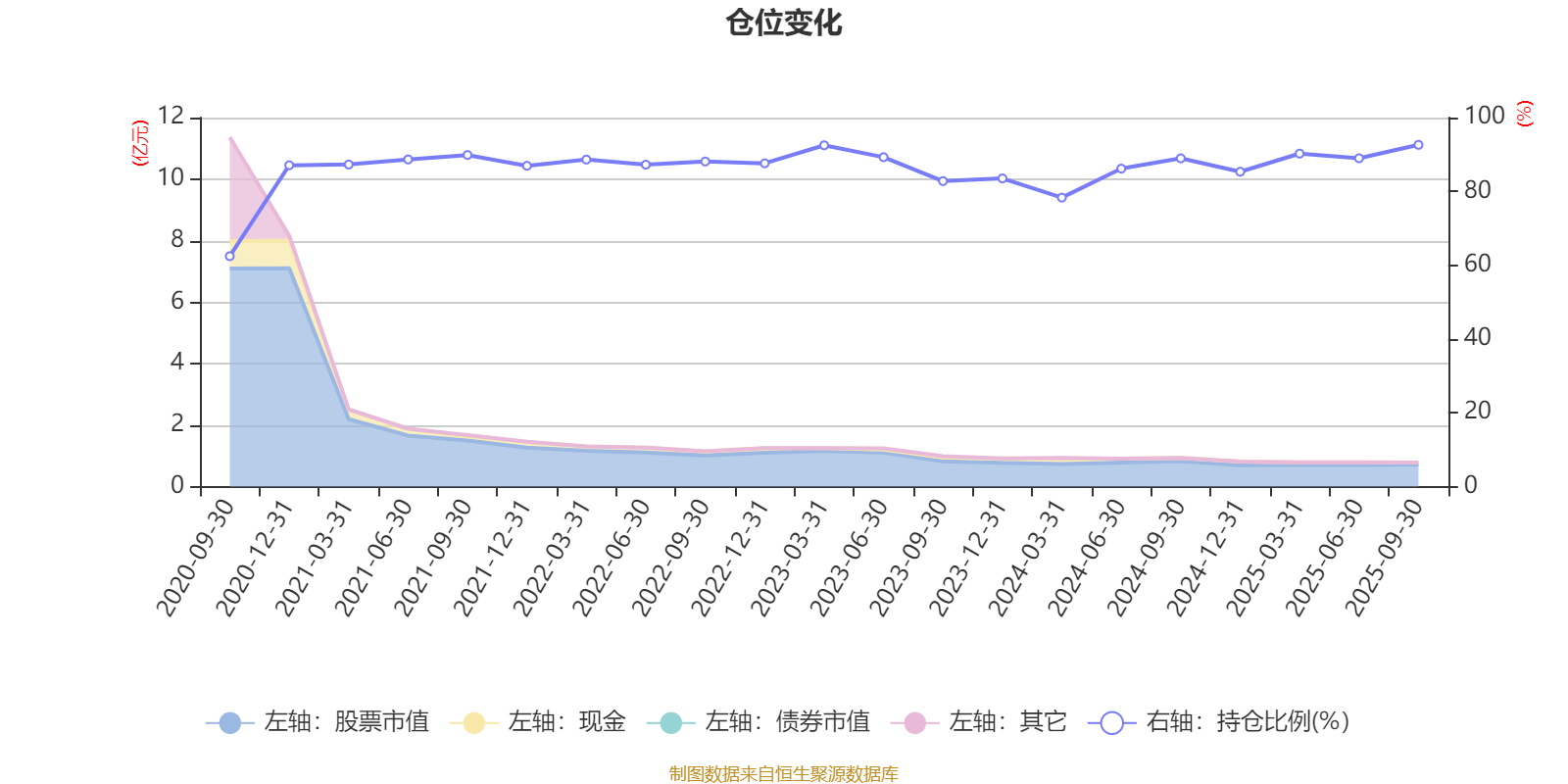 据定期报告数据统计,近三年平均股票仓位为87.19%,同类平均为88.12%。2025年三季度末基金达到92.61%的最高仓位,2020年三季度末最低,为62.44%。
