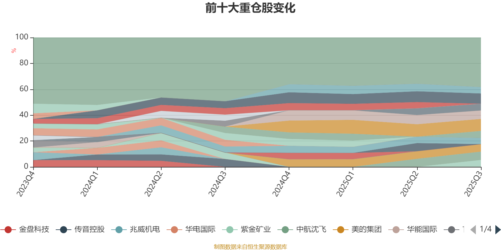 截至2025年三季度末,基金十大重仓股分别是比亚迪、东鹏饮料、海尔智家、中航沈飞、美的集团、紫金矿业、德业股份、恒瑞医药、宁波银行、中国海油。