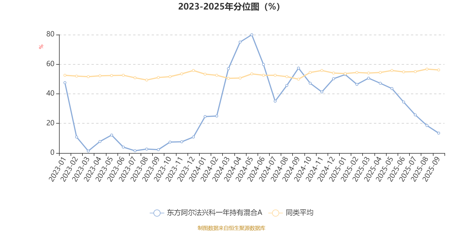 通过所选区间该基金净值增长率分位图,可以观察该基金与同类基金业绩比较情况。图为坐标原点到区间内某时点的净值增长率在同类基金中的分位数。