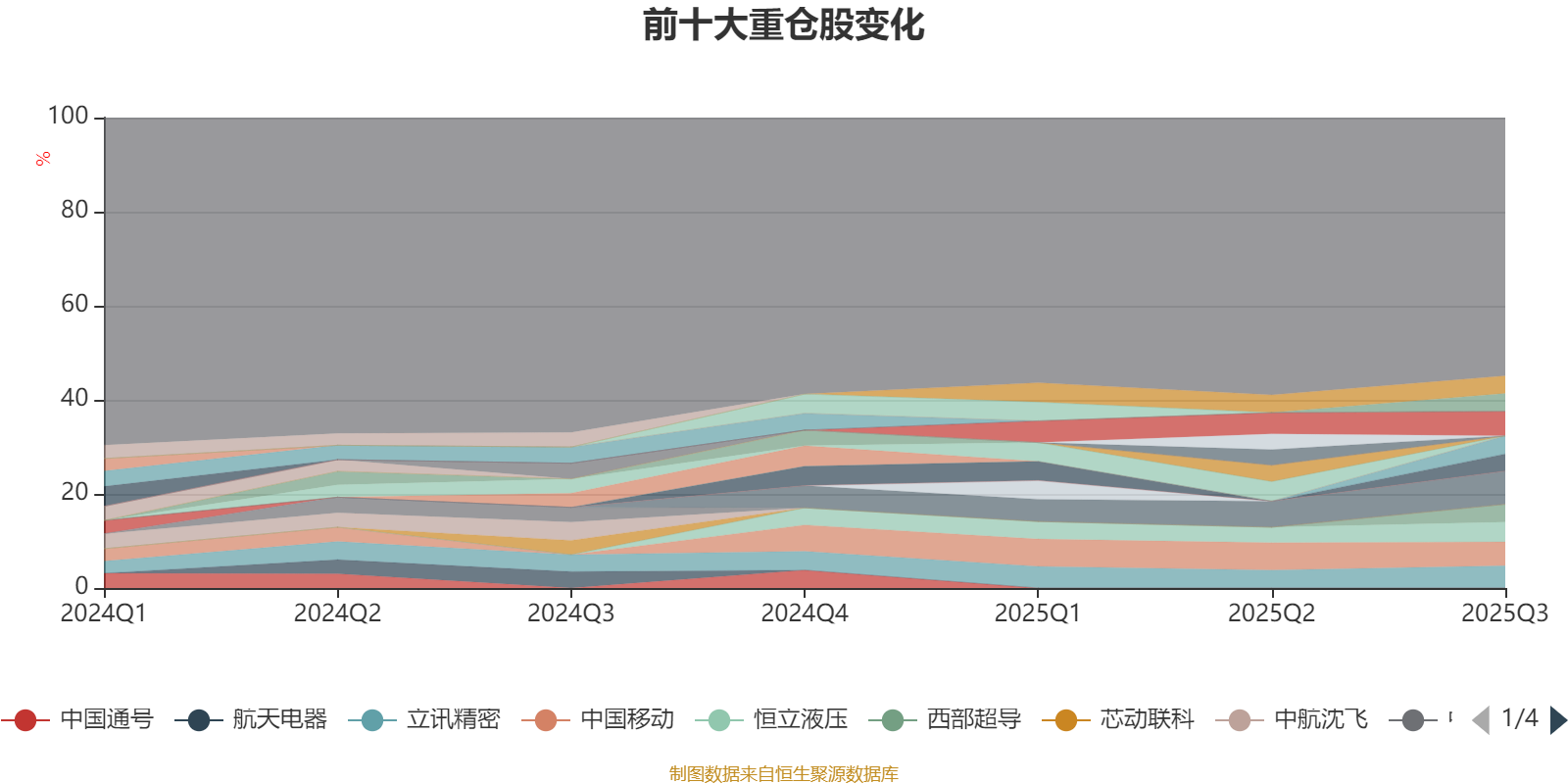 截至2025年三季度末,基金十大重仓股分别是宁德时代、吉利汽车、中国移动、立讯精密、恒立液压、华秦科技、西部超导、思瑞浦、三一重工、瑞声科技。