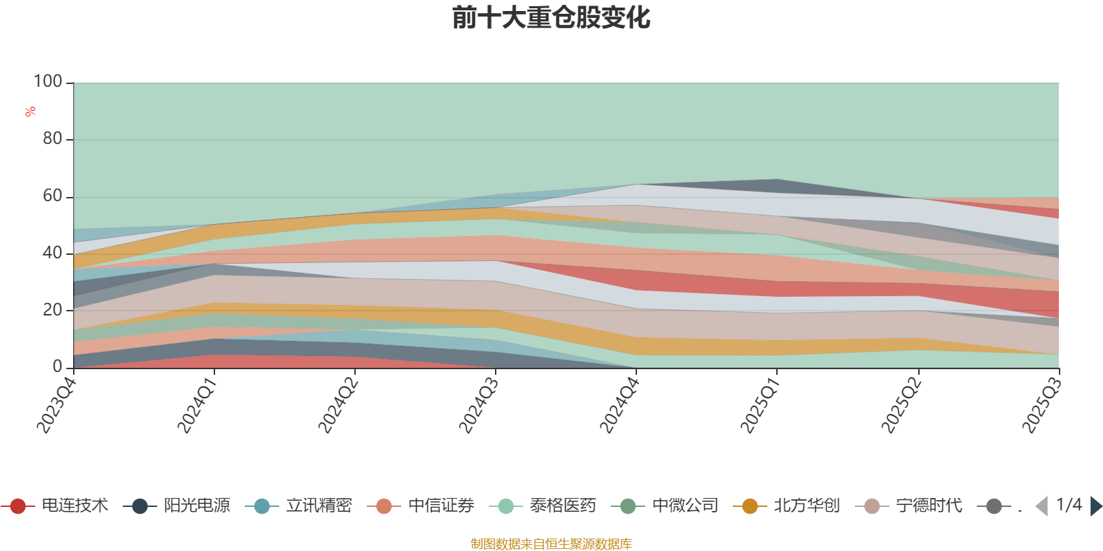 截至2025年三季度末,基金十大重仓股分别是宁德时代、寒武纪、中芯国际、海光信息、泰格医药、源杰科技、兆易创新、德业股份、翱捷科技、上汽集团。
