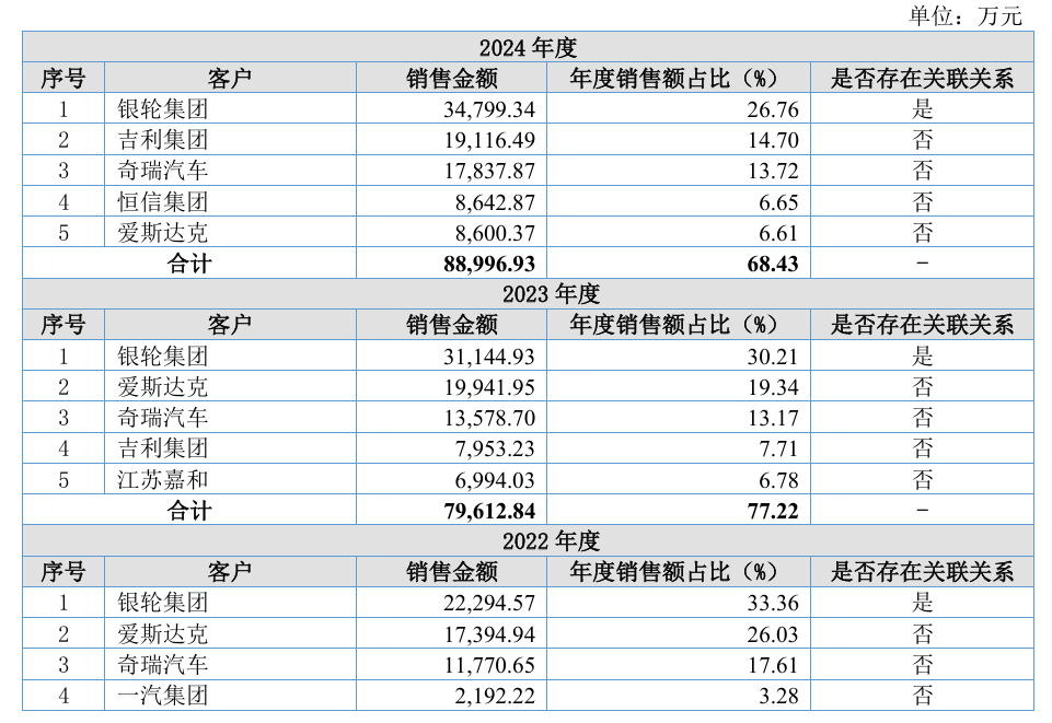客户方面,招股书显示,报告期各期,朗信电气向前五大客户合计销售占比分别为83.08%、77.22%和68.43%。其中,第一大客户银轮集团为朗信电气关联方,年度销售占比分别为33.36%、30.21%和26.76%。