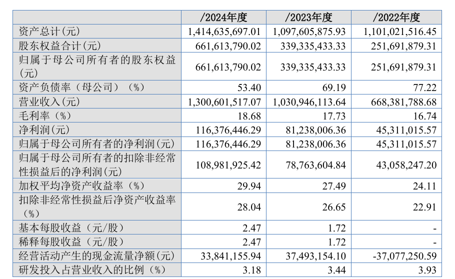 业绩方面,报告期(2022年至2024年)各期,朗信电气营业收入分别为6.68亿元、10.31亿元、13.01亿元,归母净利润分别为4531.1万元、8123.8万元、1.16亿元。2025年上半年,该公司实现营业收入约5.95亿元,归母净利润4434.06万元。