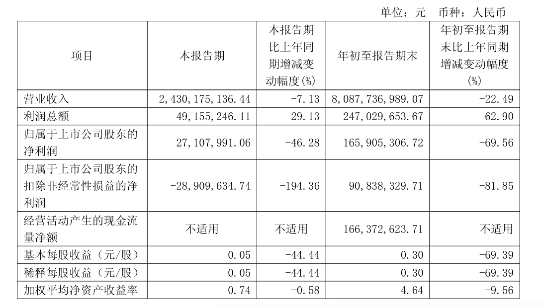 第三季度单季,太极集团营业收入为24.3亿元,同比下降7.13%;归属于上市公司股东的净利润为2710.8万元,同比下降46.28%;扣非净利润为-2890.96万元,同比暴跌194.36%。