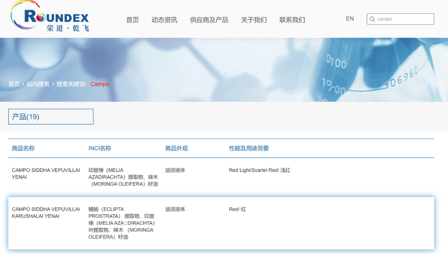涉事红色原料的源头在哪儿?尽管“老爸评测”在视频中对相关原料供应商信息作了打码处理,但网友深挖后发现,涉事供应商为一家注册于新加坡的化妆品原料公司康博Campo Research(S)Pte. Ltd(下称“Campo”)。该供应商在国内的代理商包括上海乾飞化工有限公司和广州荣道化工有限公司。