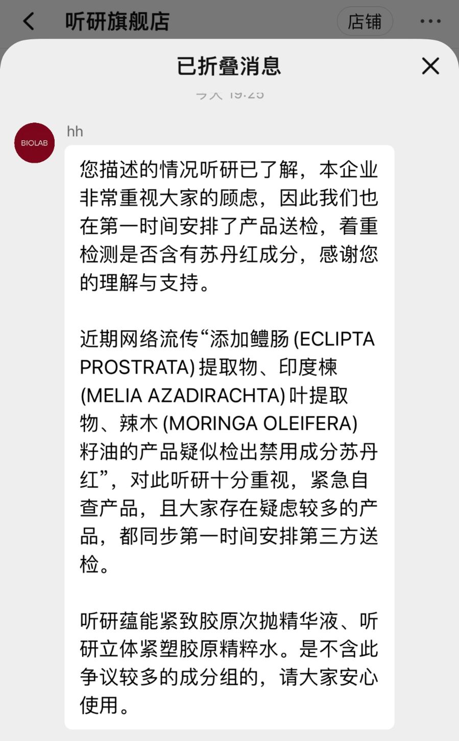 听研品牌旗舰店客服回复记者称,“在第一时间安排了产品送检,着重检测是否含有苏丹红成分”,“紧急自查产品,且大家存在疑虑较多的产品,都同步第一时间安排第三方送检”。