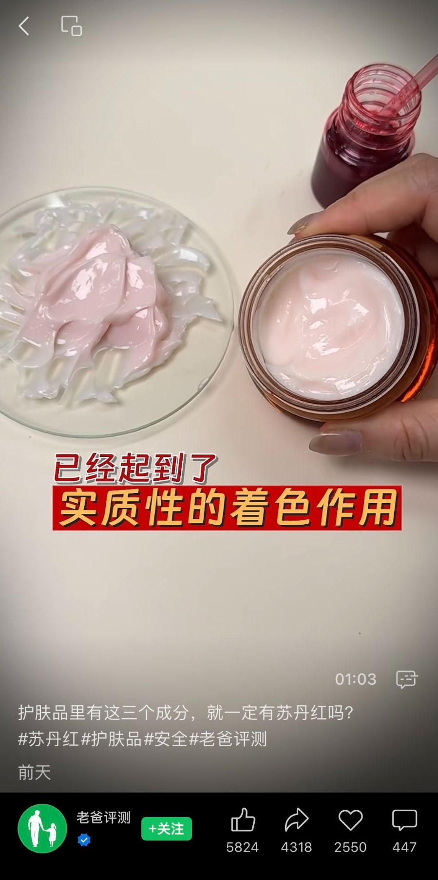 “老爸评测”发布的视频指出,其实验室在对一款肉色护肤品进行检测时,意外检出了禁用成分苏丹红。