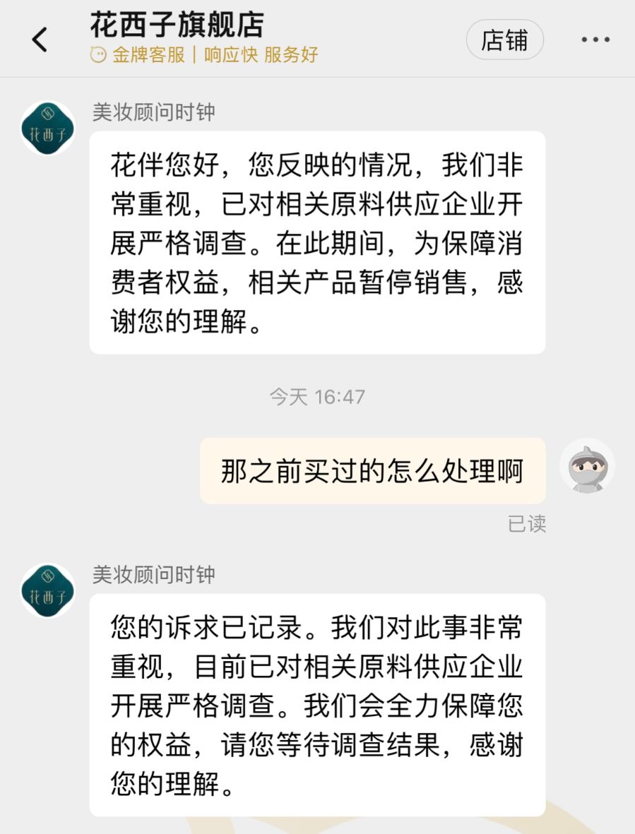 图源:花西子淘宝旗舰店客服回复截图。