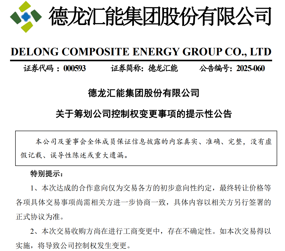 德龙汇能(000593)10月24日晚间公告,公司收到公司控股股东北京顶信瑞通科技发展有限公司的通知,获悉其与东阳诺信芯材企业管理合伙企业(有限合伙)签订《股份转让之意向协议》,拟将其持有公司29.64%股份转让给东阳诺信芯材企业管理合伙企业(有限合伙),可能导致公司控制权发生变更。目前,各方主体正在就具体交易方案、协议等相关事项进行磋商,尚存在重大不确定性,如交易双方不能达成一致,可能存在终止筹划的风险。