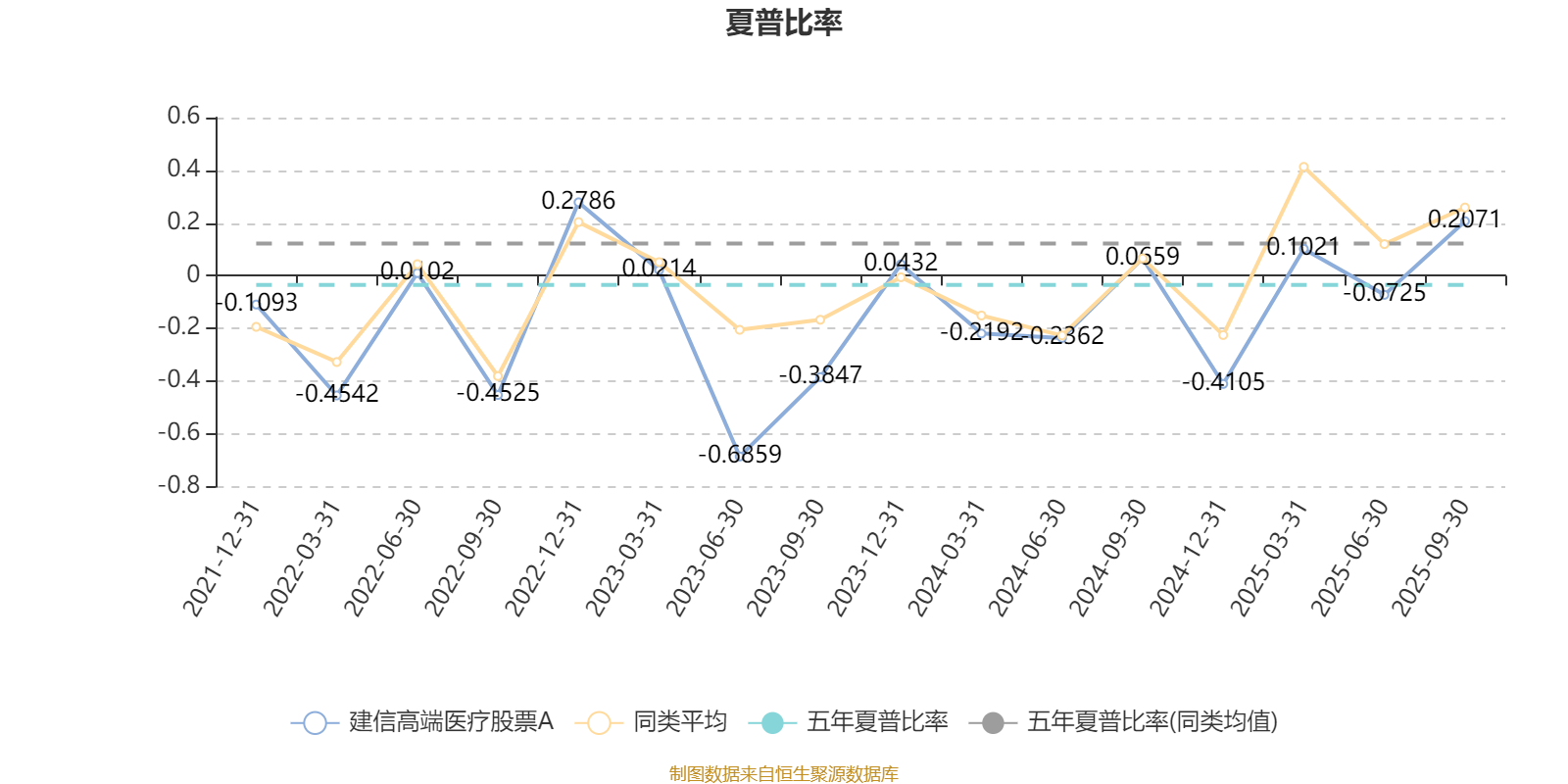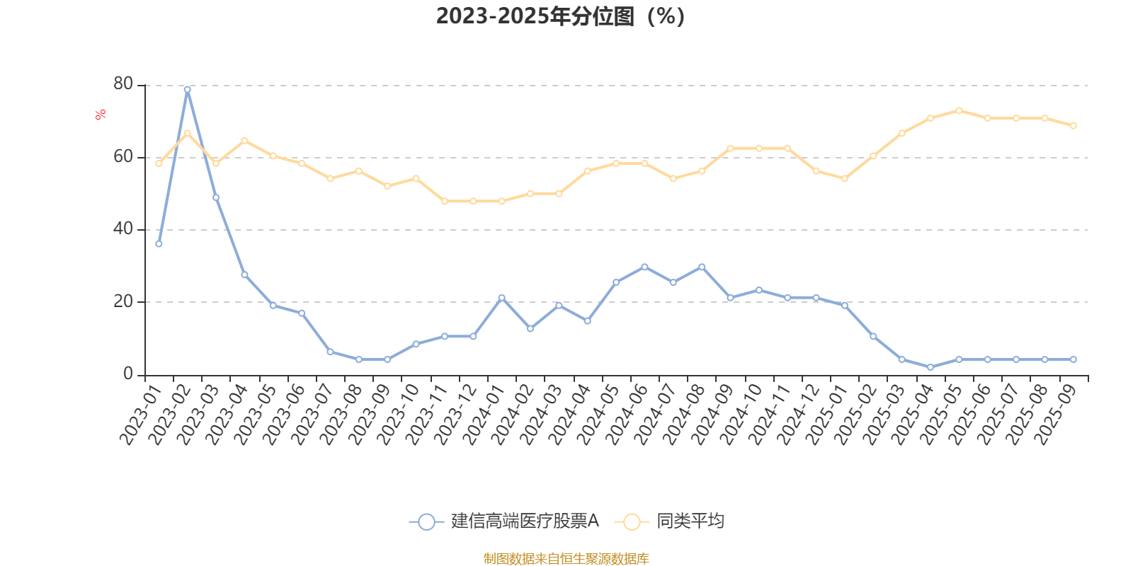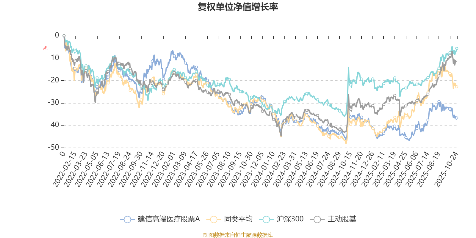 截至10月24日,建信高端医疗股票A近三个月复权单位净值增长率为-4.87%,位于同类可比基金31/57;近半年复权单位净值增长率为12.75%,位于同类可比基金46/57;近一年复权单位净值增长率为-0.78%,位于同类可比基金52/55;近三年复权单位净值增长率为-23.41%,位于同类可比基金44/48。
