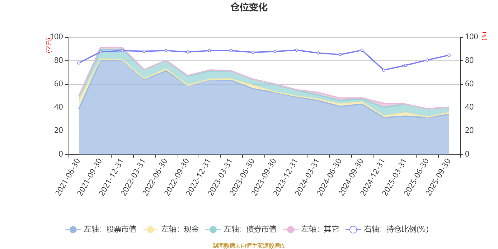 据定期报告数据统计,近三年平均股票仓位为84.68%,同类平均为72.18%。2023年末基金达到89.1%的最高仓位,2024年末最低,为72.07%。