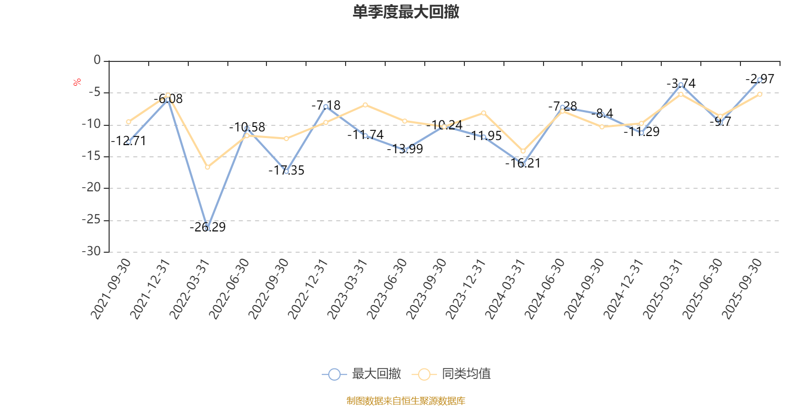 截至10月24日,基金近三年最大回撤为39.79%,同类可比基金排名904/1283。单季度最大回撤出现在2022年一季度,为26.29%。