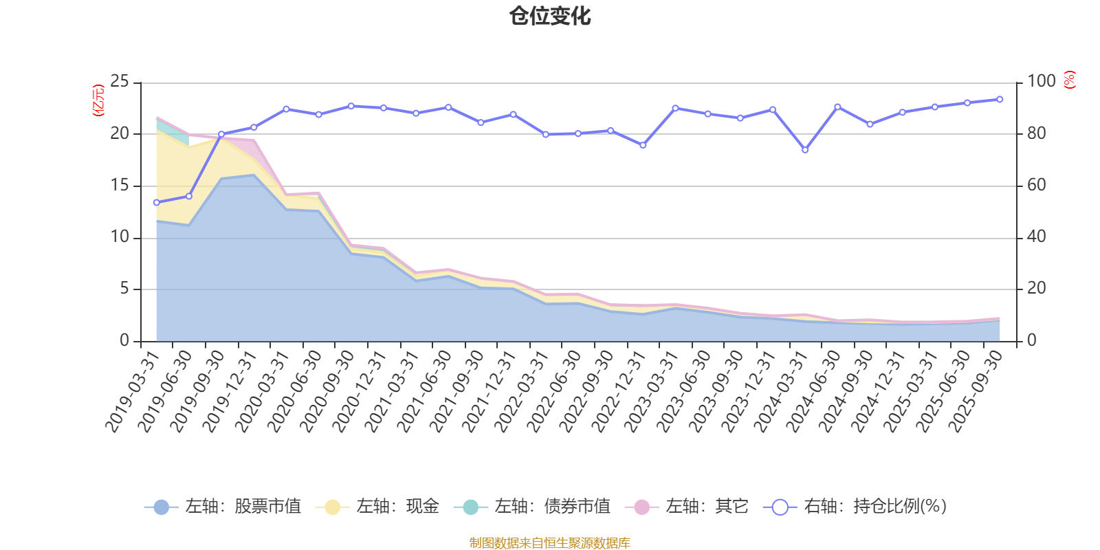 据定期报告数据统计,近三年平均股票仓位为86.89%,同类平均为72.18%。2025年三季度末基金达到93.51%的最高仓位,2019年一季度末最低,为53.64%。