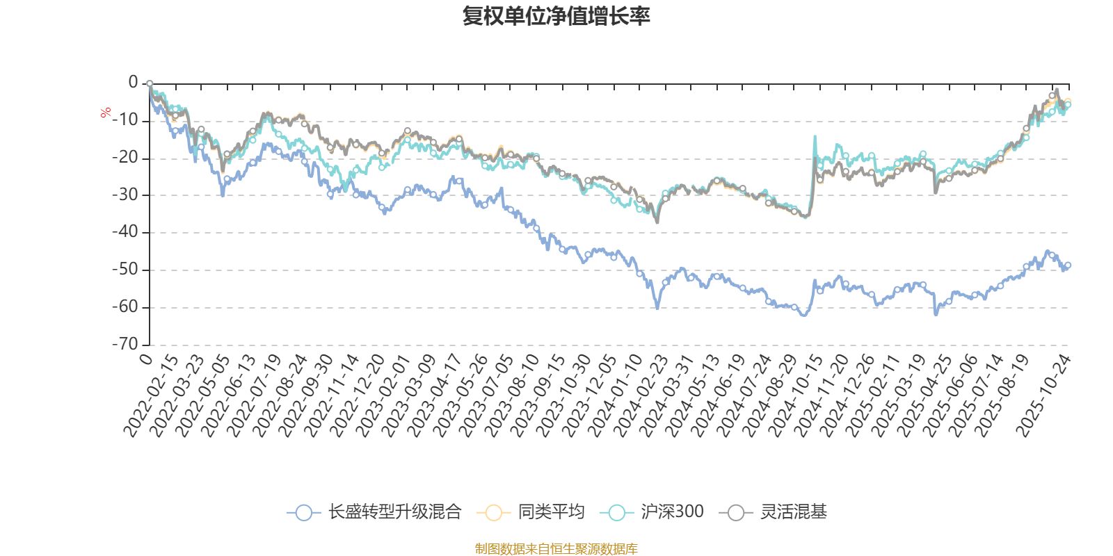 截至10月24日,长盛转型升级混合近三个月复权单位净值增长率为7.08%,位于同类可比基金818/1287;近半年复权单位净值增长率为23.63%,位于同类可比基金614/1287;近一年复权单位净值增长率为12.28%,位于同类可比基金885/1287;近三年复权单位净值增长率为-28.64%,位于同类可比基金1251/1286。