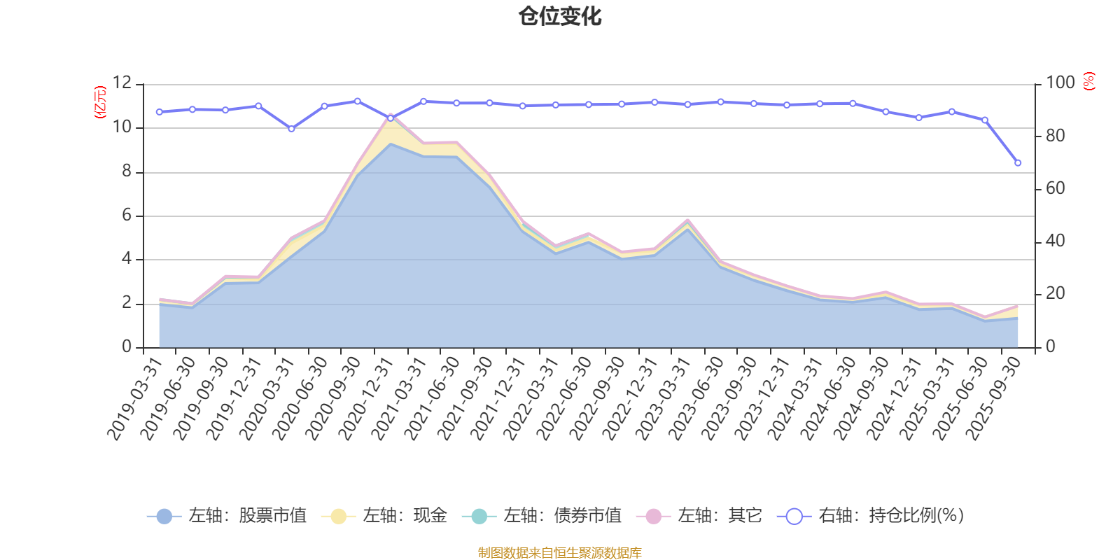 据定期报告数据统计,近三年平均股票仓位为89.24%,同类平均为72.18%。2020年三季度末基金达到93.48%的最高仓位,2025年三季度末最低,为70.08%。