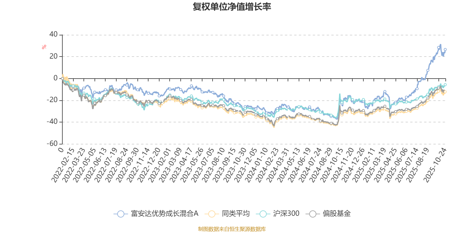 截至10月24日,富安达优势成长混合A近三个月复权单位净值增长率为29.73%,位于同类可比基金40/265;近半年复权单位净值增长率为63.39%,位于同类可比基金14/265;近一年复权单位净值增长率为58.38%,位于同类可比基金18/265;近三年复权单位净值增长率为43.31%,位于同类可比基金35/253。