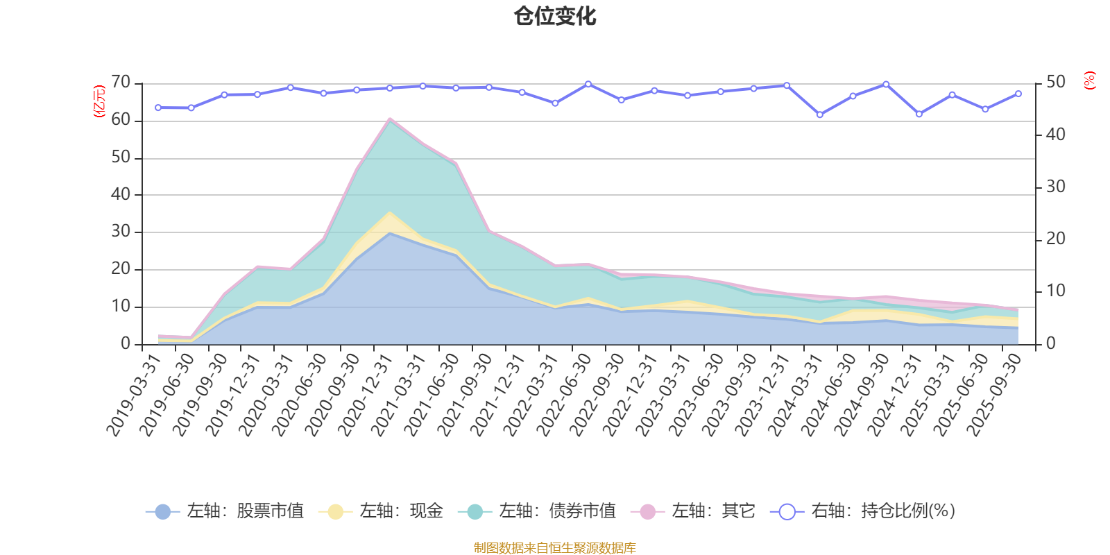 据定期报告数据统计,近三年平均股票仓位为47.46%,同类平均为67.21%。2022年上半年末基金达到49.84%的最高仓位,2024年一季度末最低,为43.99%。